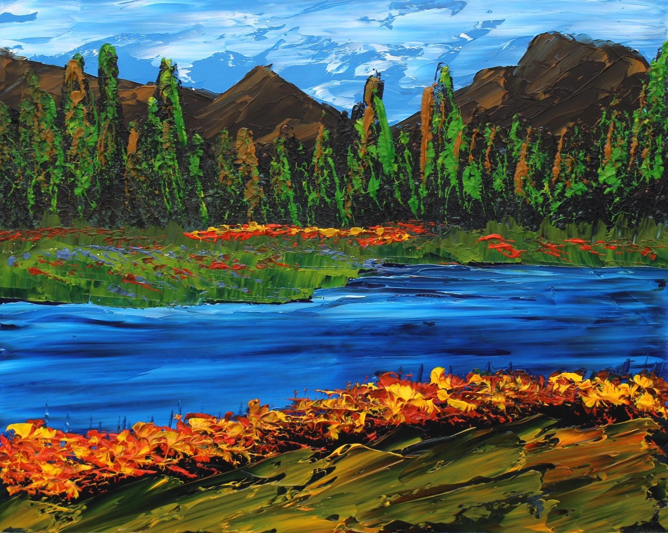 At the heart of the composition lies a tranquil river, winding gracefully through lush green banks bursting with color. The artist captures the serenity of nature with brilliant impasto strokes, allowing the viewer to almost sense the gentle movement of the water. Along the edges, textured flowers bloom in vivid hues, adding warmth and energy to the scene. In the distance, majestic mountains rise softly beneath a radiant sky, suggesting peace, depth, and a connection to the vastness of nature.